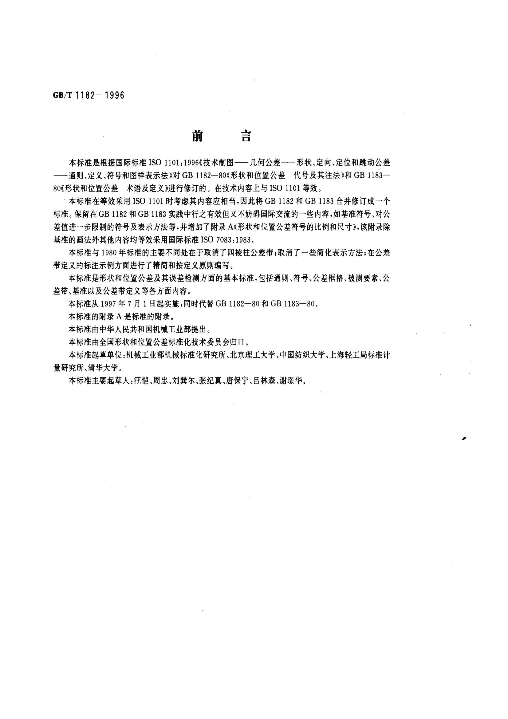 本標準是根據(jù)國際標準ISO 1101:1996《技術(shù)制圖一幾何公差一- 形狀、 定向、定位和跳動公差通則、定義、符號和圖樣表示法》對GB 1182- - -80《形狀和位置公差代號及其注法》和GB 1183-...